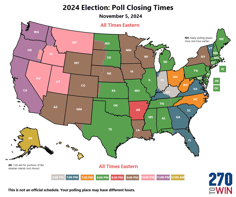 Here is a list of the poll closure times in the core seven swing states in order of first to last and below is a map of poll closings in all fifty states, all listed in eastern standard time in the list and the map.