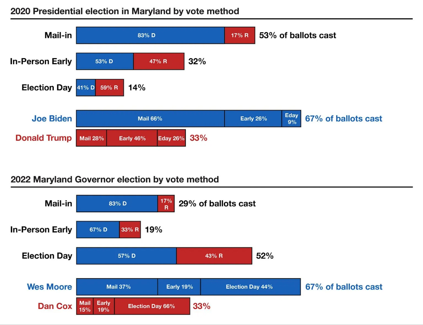 Democrats still have the advantage in some states, according to early voting data where party registration is available and according to polling, though notably not in Nevada or Arizona. It is worth noting voting behavior shifted back to pre-2020 levels among Democrats in many states in the 2022 midterms, whether a state was competitive or not. Also, research from Black Voter Project show 34 percent of Black voters will vote on Election Day, which should benefit Dems in Georgia, North Carolina and in heavy Black cities like Philly, Milwaukee, and Detroit. Below is an example of how Democrats shifted their vote method in Maryland: