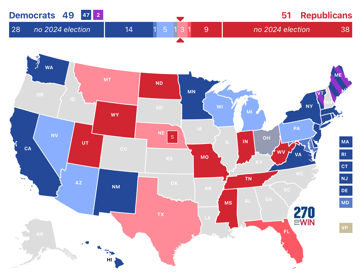 Democrats sweep every other competitive race. Incumbents Bob Casey (PA) and Tammy Baldwin (WI) have closer than normal results but still win by anywhere between 3-6 points and easily outrun Harris. Jacky Rosen (NV) will win by 3-5, outrunning Harris by a bit. There are two open seats in Michigan and Arizona due to retirements which Democrats will both win, though Ruben Gallego in Arizona will have a more comfortable margin than Elissa Slotkin in Michigan. They are both very good candidates, but Slotkin’s opponent is pretty generic while Gallego faces Kari Lake, who lost the gubernatorial race in 2022 and spread lies about voter fraud. She is so toxic in Arizona that I see Gallego winning by about 5 points while Slotkin will win by 2-3 points. Gallego significantly outruns Harris, but Slotkin more closely matches the presidential margin.
