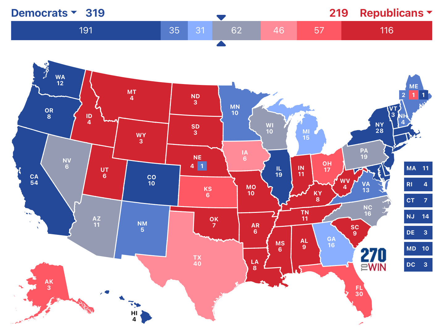 I think Vice President Kamala Harris will win, achieving 319 Electoral College votes and thus sweeping all seven swing states. The states I’m least confident in are Arizona and North Carolina. I think she ekes out very small wins there but can easily see Trump winning one or both. Moderate voters are tired of Trump’s bullshit in his third straight campaign. I think women - especially college students, senior women, and more Republican women than usual - are going to come out in massive numbers for Harris, largely because Roe v. Wade was overturned but also because Trump disgusts them. She has also had a significant fundraising and spending advantage and her advisors say late deciders are breaking for her by double -digits, which was validated by NYT surveys of the seven swing states this past weekend.