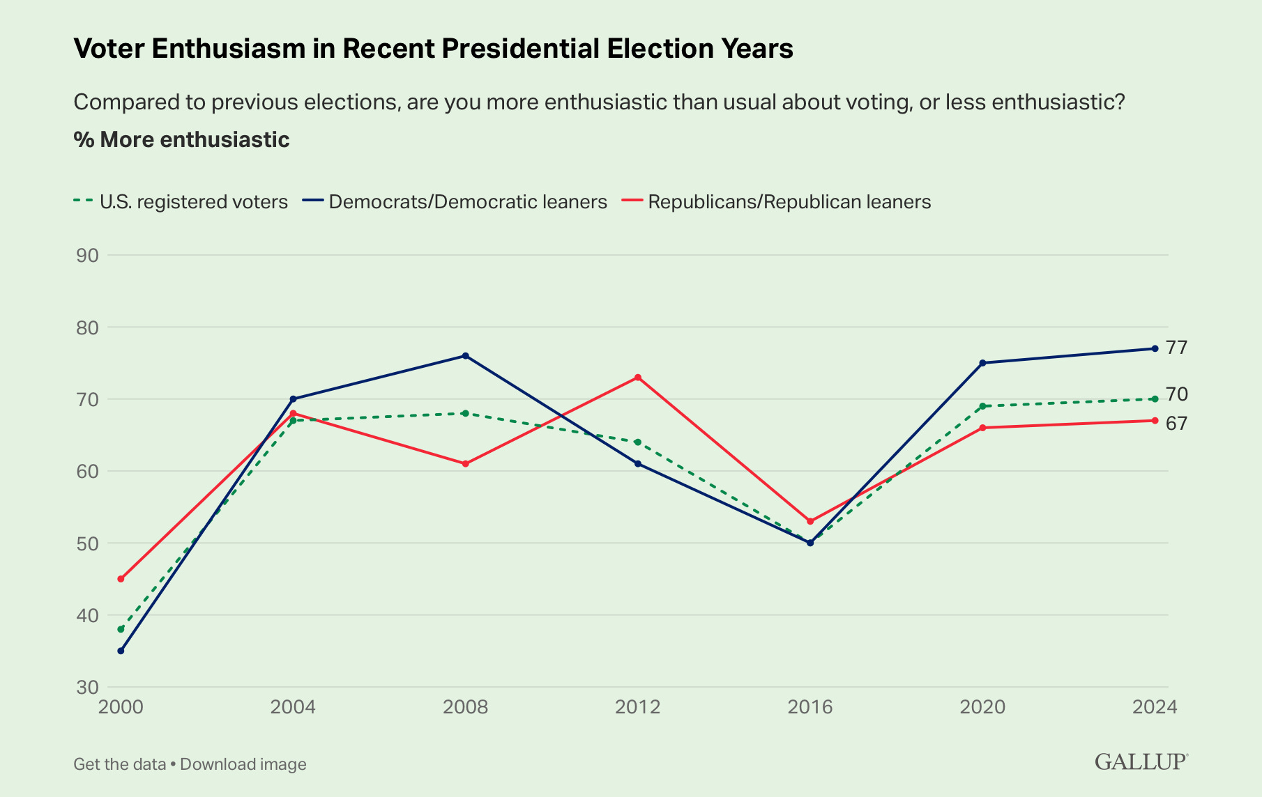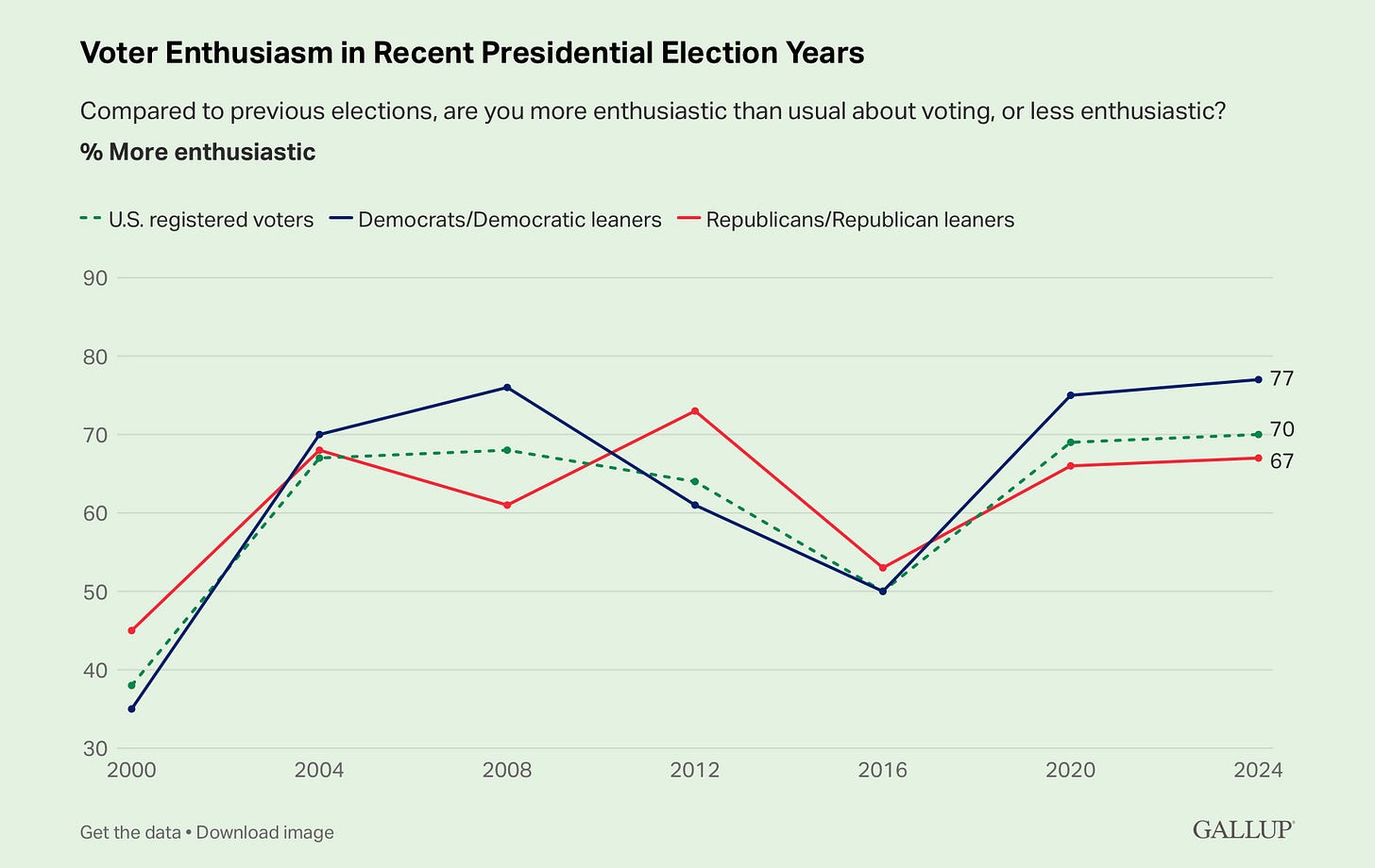 Milwaukee County, where Biden won by 40 points, has marginally improved since Obama won it by 36 points twice. However, in 2012 Milwaukee had an 86 percent turnout among registered voters, which far exceeded the poor 70 percent in 2016 and 76 percent turnout in 2020. Clinton had a huge enthusiasm problem and Dems didn’t do any in-person GOTV in 2020, though they did plenty of digital organizing. Harris has generated a level of enthusiasm among Dems not seen since 2008, according to Gallup. Can her candidacy get Milwaukee to 80-plus percent turnout again?