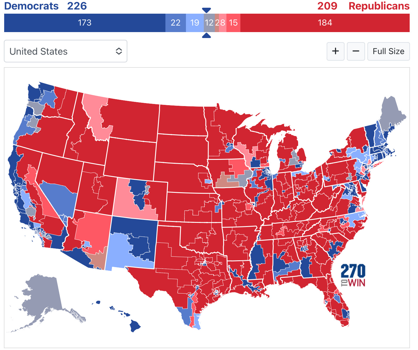 There are several Democrats in districts Trump won who will all narrowly hang on because they are great candidates and/or have weak opponents. Matt Cartwright (PA-08), based in Lackawanna and Luzerne, has consistently outrun Dems at the top of the ticket in the Trump era. He has a strong brand locally and will win again. Marie Glusenkamp Perez (WA-03), which includes Vancouver’s suburbs and a lot of rural southwestern Washington, will win a very tight race again despite Trump winning by four points in 2020 because she is facing a right wing and toxic candidate in Joe Kent, who she defeated in 2022. Jared Golden (ME-02), who represents rural and Trump-friendly Maine, will barely win again because he is well-liked and has separated himself from the national party well. Mary Peltola (AK-AL) is in the most Republican House seat as Alaska voted for Trump by ten points but is very moderate and well-liked. Even Republican Senator Lisa Murkowski said she hoped Peltola wins.